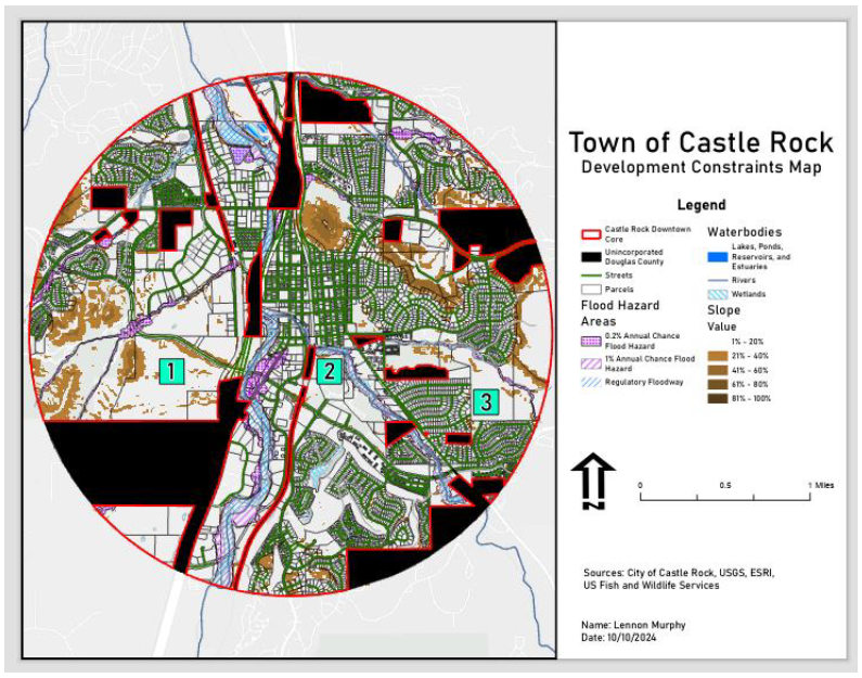 In this activity, we were tasked with layering GIS data to identify suitable sites for development in a town outside of Denver, Colorado. This included creating Slope layers and working to make the map a visually stark and useful representation of the data.